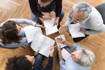 Grupo de personas trabajando en equipo sobre un documento.