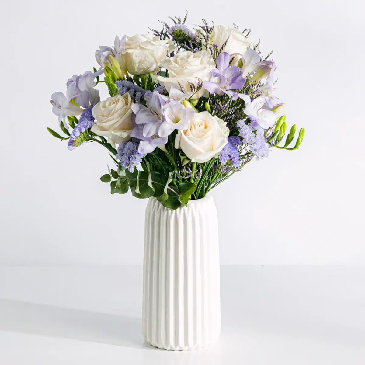 En cuanto veas el ramo Alice, te acordarás de la tranquilidad y el amor puro. Las rosas blancas son el acompañamiento perfecto para las flores moradas del arreglo, especialmente las freesias y el limonium, que añaden un toque elegante y salvaje a la vez. Sorprende a esa persona especial y hazle saber que siempre estarás a su lado. Ideal para… Decirle a alguien que le quieres.